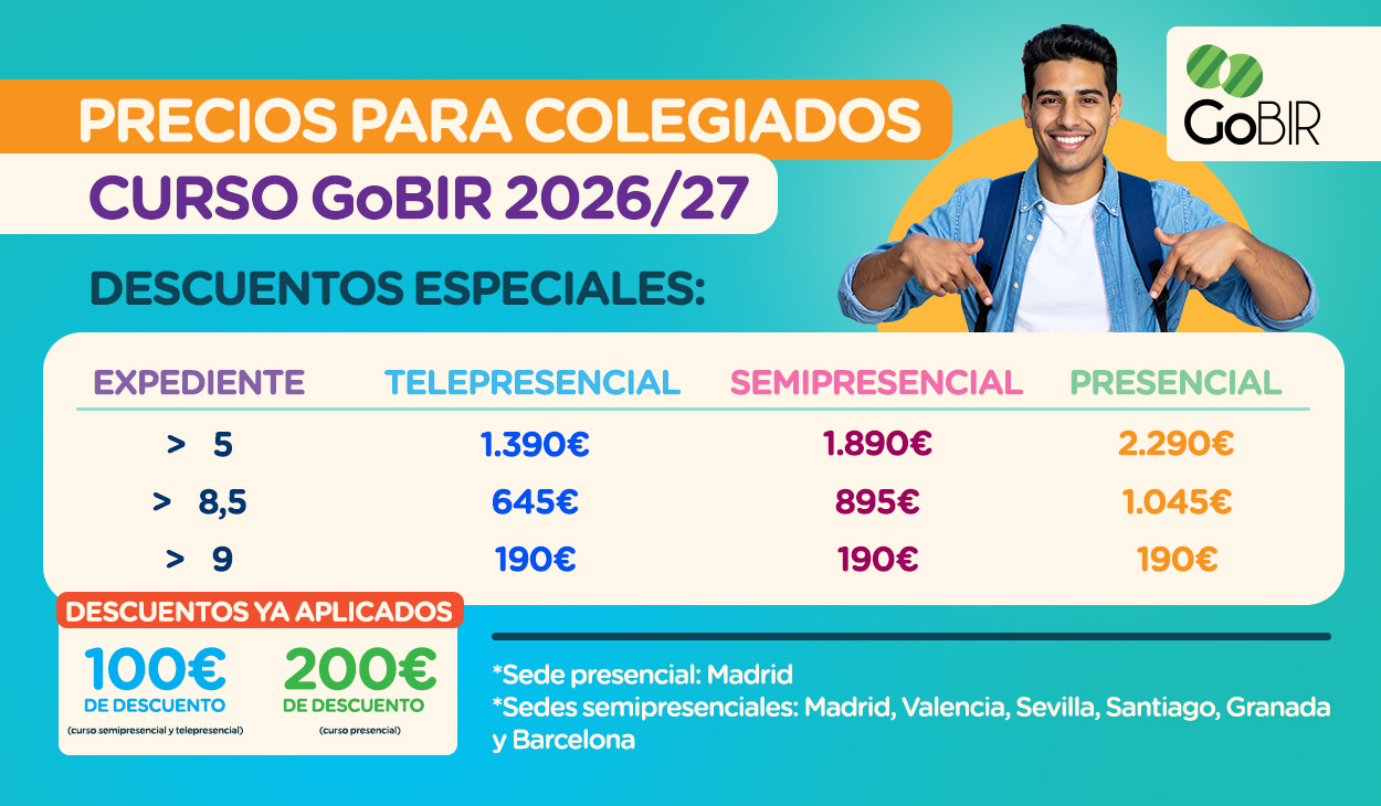 Como colegiado te queremos recordar que tienes un descuento en los cursos de la Academia GoBIR con comienzo: 11 de mayo, 10 y 24 de agosto de 2026.